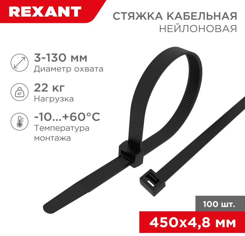 Хомут-стяжка кабельная нейлоновая 450x4,8мм, черная (100 шт/уп) REXANT (07-0451-5)