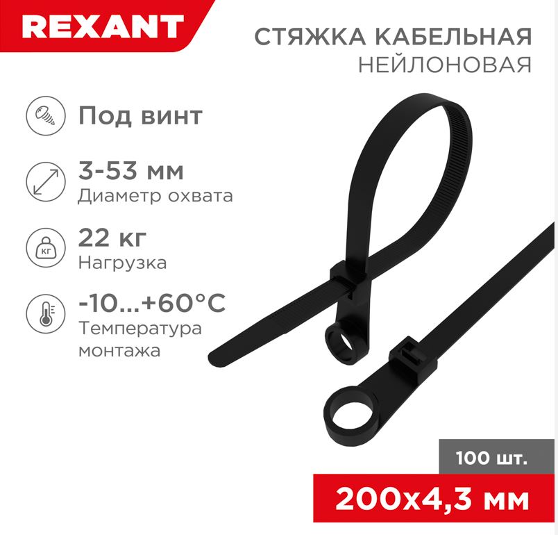 Хомут-стяжка кабельная нейлоновая под винт 200x4,3мм, черная (100 шт/уп) REXANT (07-0205)