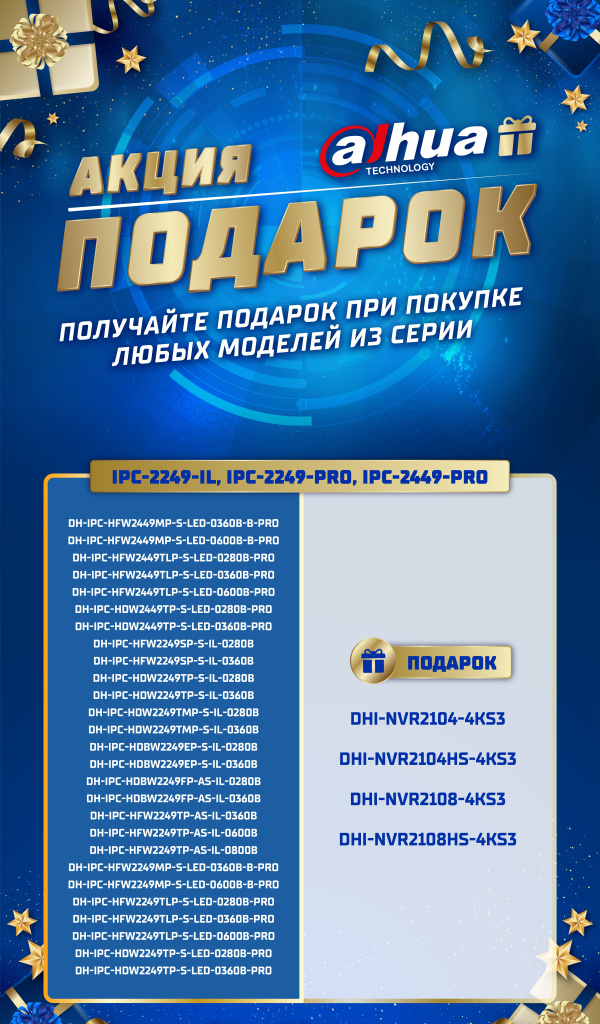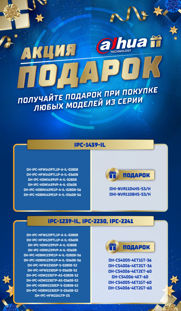 При закупке камер моделей 1439-IL/2249-IL/2249-PRO/2449-PRO или 1239-IL/2230/2241 вы можете получить NVR или PoE-коммутатор в комплекте.